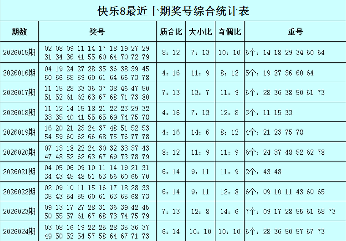 福彩快乐8第2026024期开出奖号:03 08 16 19 22 25 28 35 36 37 49 50 52 54 57 58 64 67 71 73,其中奖号质合比为6:14,四区比为4:6:6:4,包含6个重号28、36、50、57、67、73,包含连码35 36 37、49 50、57 58,包含7个邻号08 16 35 37 49 54 58。