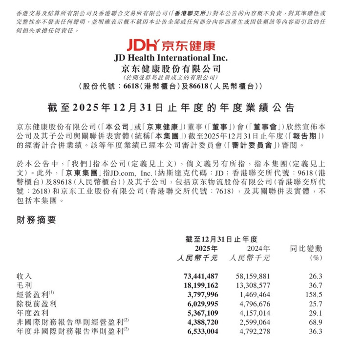 3月5日,京东健康(HK06618)发布2025年全年业绩公告,公司全年实现总收入734亿元,同比增长26.3%;实现归母净利润53.75亿元,同比增长29.16%;非国际财务报告准则指标下(Non-IFRS)净利润为65亿元,同比增长36.3%,净利润率达到8.9%。
