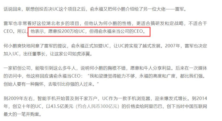 可以说,UC顺利被阿里收购,就有雷军的一份力在。