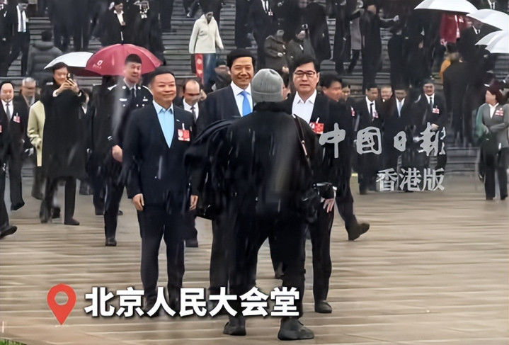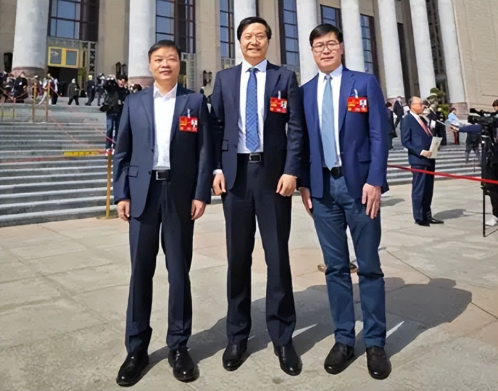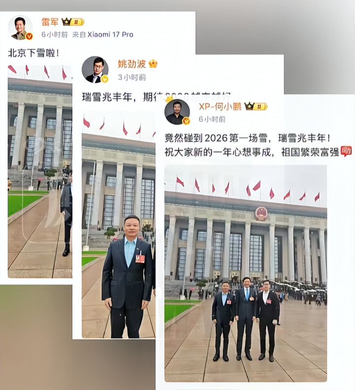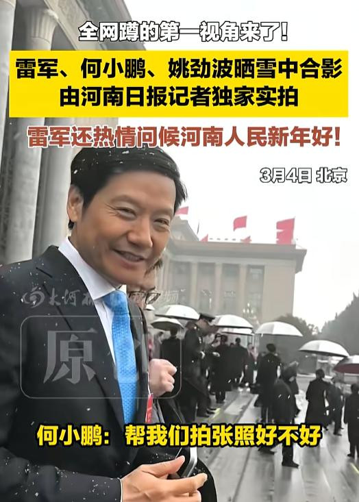 全国人大代表雷军、何小鹏和姚劲波在会场外偶遇。