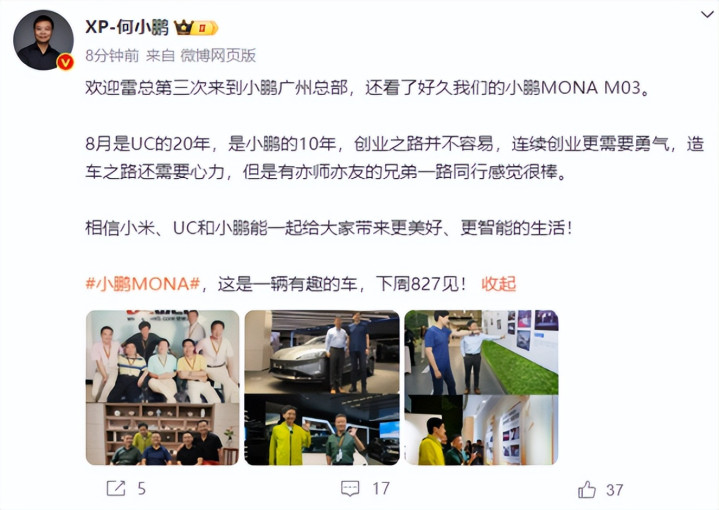 所以小鹏上市时,他第一时间邀请雷军。