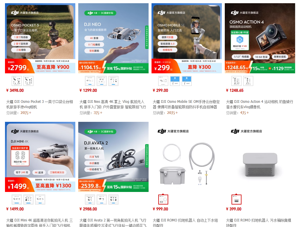 10月8日,大疆在官网提前挂出“双十一”促销信息,多款产品价格直降数百至上千元。此次降价幅度较大。从几百元到几千元不等。其中还包括今年8月份发布的扫地机、7月份发布的全景相机等也在降价之列。此举也引发大量消费者不满,官方表示:将不断优化相关服务与沟通机制。